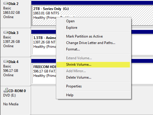 - You will need Unallocated hard disc partition to create a new partition. If you do not have any Unallocated space, you can create it by simply shrinking an existing disk partition. To do this simple right-click your hard drive partition click Shrink Volume (See picture below)